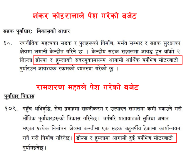 अघिल्लो वर्ष अर्थमन्त्री शंकर कोइरालाले गरेको बजेटमा भनिएको थियो, ‘सडक सञ्जालमा आवद्ध हुन बाँकी २ जिल्ला डोल्पा र हुम्लाको सदरमुकामसम्म आगामी आर्थिक वर्षभित्र मोटरबाटो पुर्याउन आवश्यक रकमको व्यवस्था गरेको छु ।’