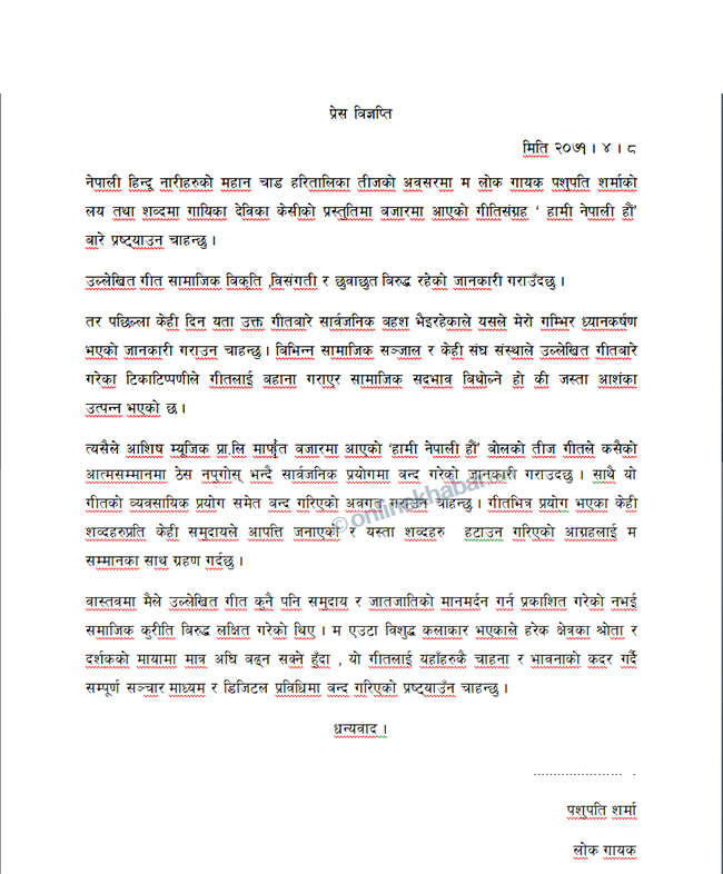 शर्माले बिहीबार विज्ञप्ति जारी गर्दै भनेका छन्-’हामी नेपाली हौं’ बोलको तीज गीतले कसैको आत्मसम्मानमा ठेस नपुगोस् भन्दै सार्वजनिक प्रयोगमा बन्द गरेको जानकारी गराउदछु । साथै यो गीतको व्यवसायिक प्रयोग समेत बन्द गरिएको अवगत गराउन चाहन्छु ।’ यसअघि शर्माले अनलाइनखबरसँगको कुराकानीमा पनि आफू दलित समुदायको सम्मानमै गीत बनाएको बताएका थिए ।