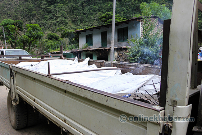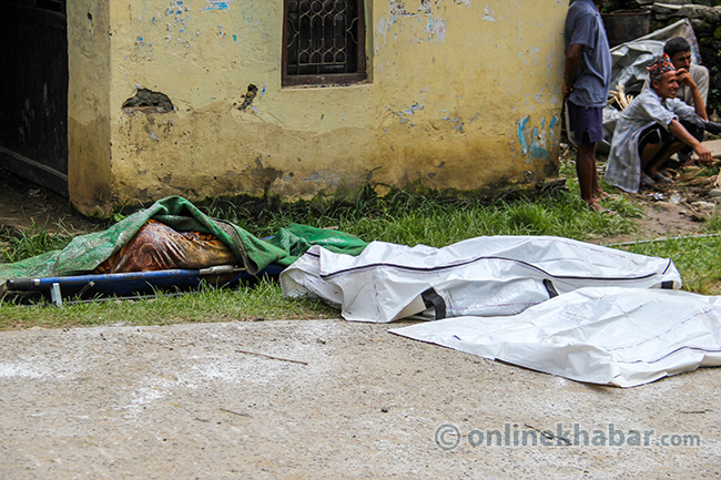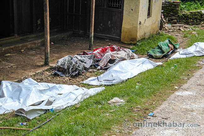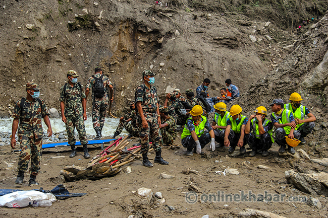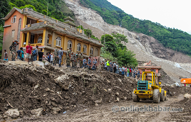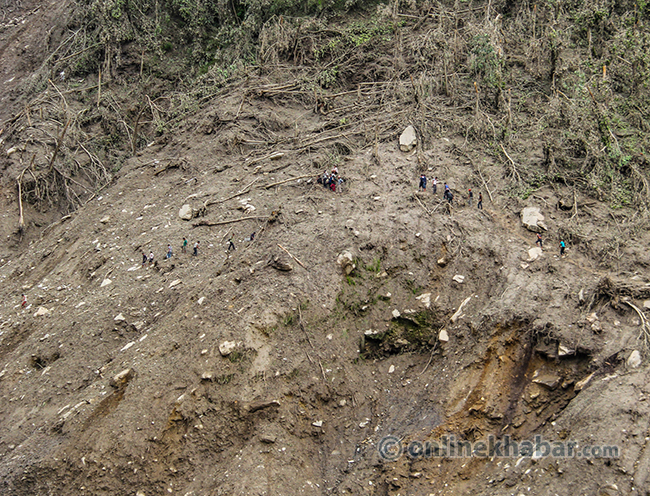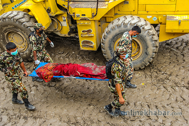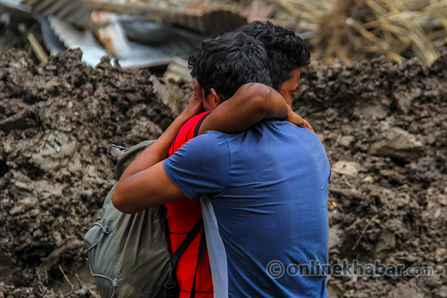 २० साउन, पांग्रेटार (सिन्धुपाल्चोक) । भविष्यका योजना बुन्दै शुक्रबार राति सुतेका सिन्धुपाल्चोकको जुरेबासीले उज्यालो देख्न पाएनन् । शनिबार विहान सिंगो पहाड नै खसेर पुरेपछि जुरे गाउँ अहिले बगरमा परिणत भएको छ । गाउँसँगै पुरिएर ज्यान गुमाएका स्थानीयको शव उद्दारकर्मीले धमाधम निकालिरहेका छन् । पहिरोमा परेर वेपत्ता भएकामध्ये ३३ जनाको शव निकालिसकिएको छ । सुरक्षाकर्मीले डोजरको सहयोगमा शव निकाल्दै गर्दा मृतकका आफन्तको रुवाबासीले सुनकोशी बगर शोकमा डुबेको छ ।