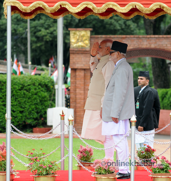 भारतीय प्रधानमन्त्रीलाई सलामी दिएका ठाउँमा प्रधानमन्त्री कोइराला पनि उभिएका थिए । सलामी अर्पण गरेका बेला मोदीले सलाम गरेका थिए भने अनुहारै ढाक्ने गरी ठूलोखालको कालो चश्मा लगाएका थकित जस्ता देखिने प्रधानमन्त्री कोइराला हात नउठाई उभिएका थिए ।