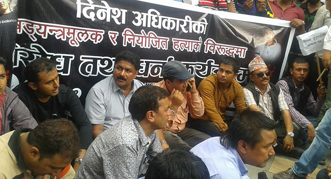 धर्ना कार्यक्रममा एमाले केन्द्रीय सदस्य खेम लोहनी, अनेरास्ववियुका उपाध्यक्ष ऐन महर र दिनेशका दाजु धु्रब अधिकारीले पनि बोलेका थिए । ध्रुव दिनेशको हत्याबारे छानविन नगरुन्जले शन नबुझ्ने बताए ।